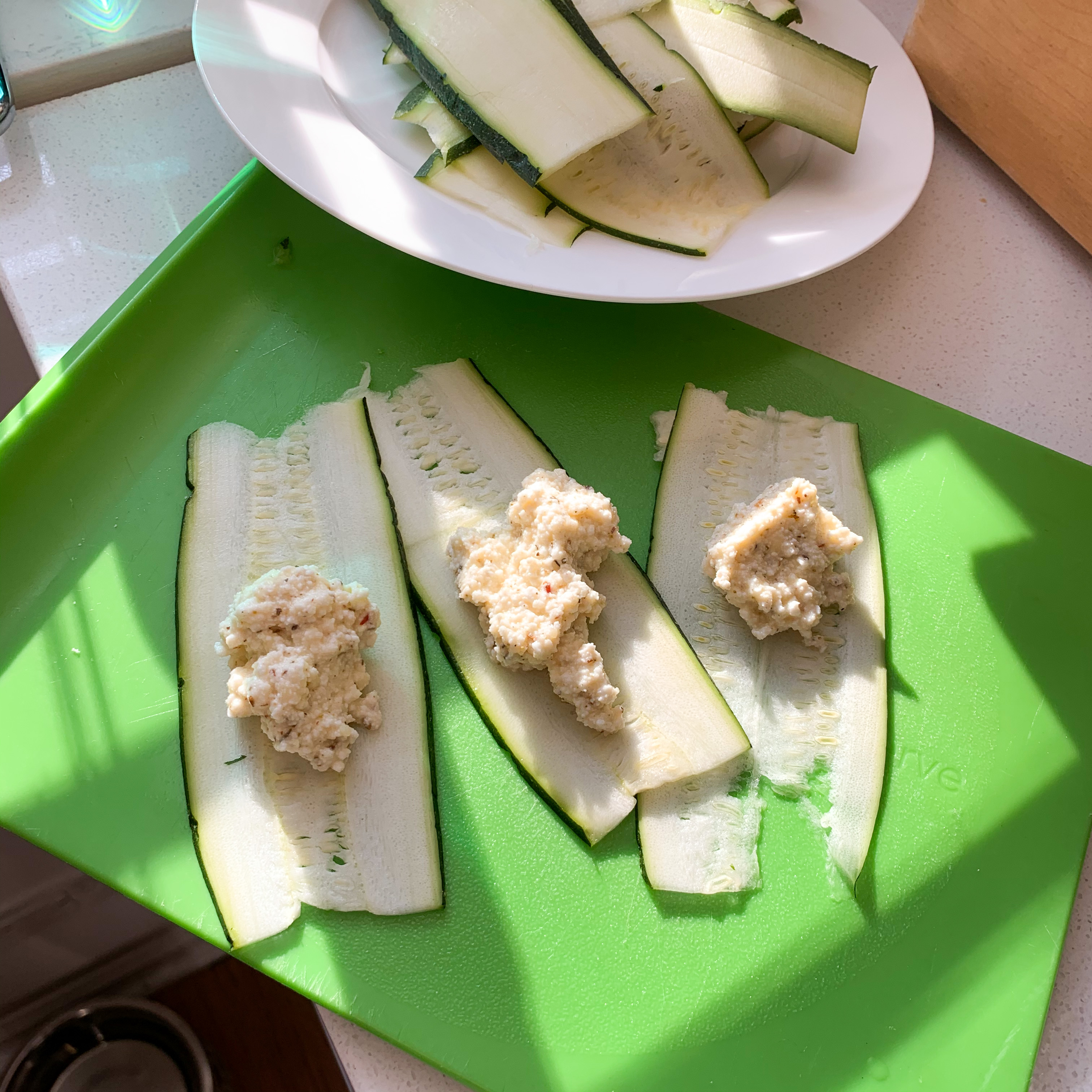 - Mix 2T parmesan, ricotta, Italian seasoning, and egg.