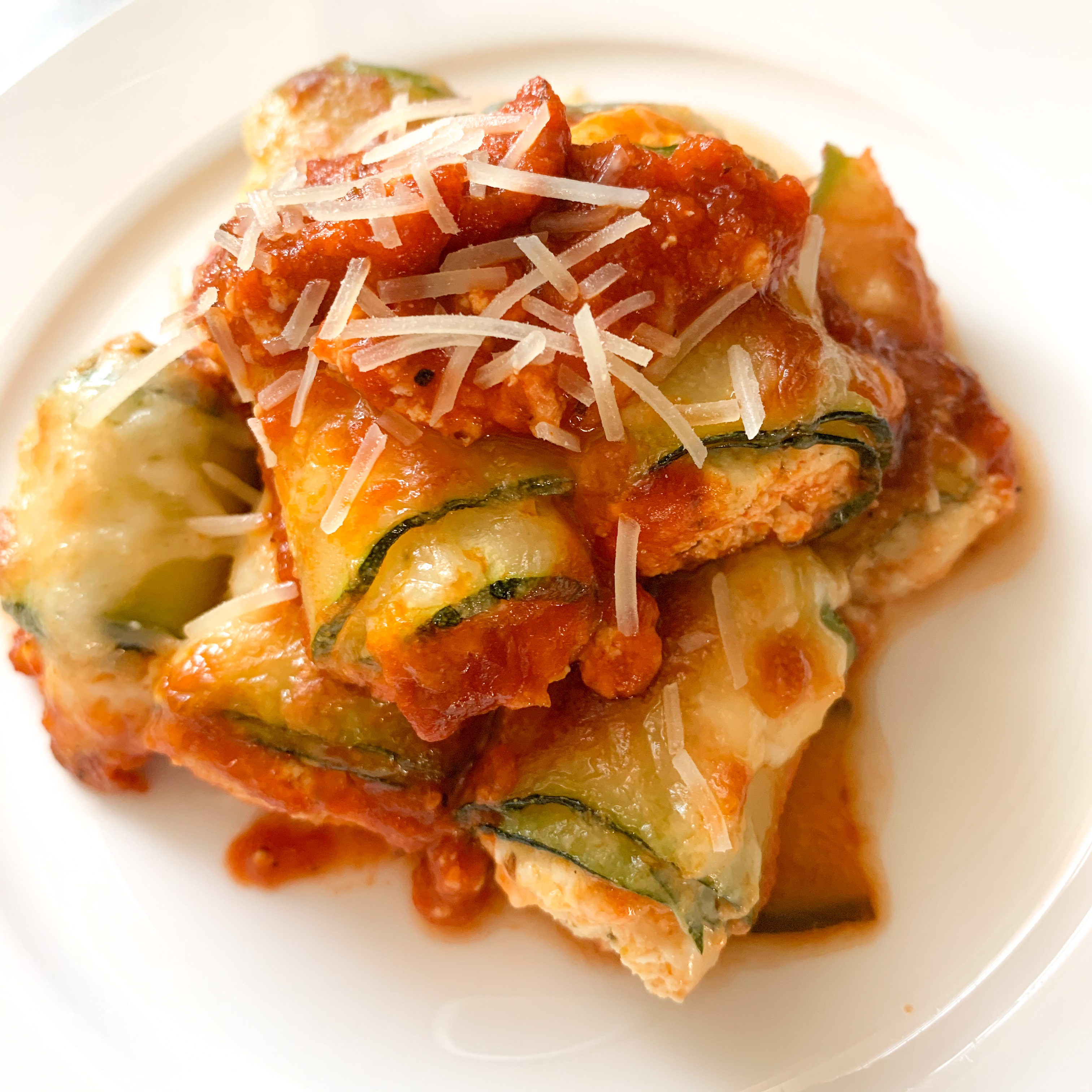 One last thought: I saw a similar recipe online that yielded five servings, 1/2 Lean per serving, and 3 Condiments per serving. Personally, I don’t like to make a Lean & Green with so many servings. I prefer to eat a meal no more than two days in a row {and I don’t like to freeze meals}. I also like my Lean & Green recipes to be complete meals {1 Lean, 3 Greens} and I try to constrain the number of Condiments so I have room for almond milk in my daily shakes. That said, you could absolutely double or triple this recipe if you’re serving a family and/or you could add lean ground turkey if you want to add meat. In that case, I would suggest adding 7 oz of COOKED 98% fat free ground turkey {1 Lean} to the ricotta mixture, 120g Zucchini {2 greens} and 1/4 C Rao’s Marinara {1 Green}. I wouldn’t change the cheese proportions. That would turn the entire dish to three complete Lean & Greens and only 1 Condiment per serving.