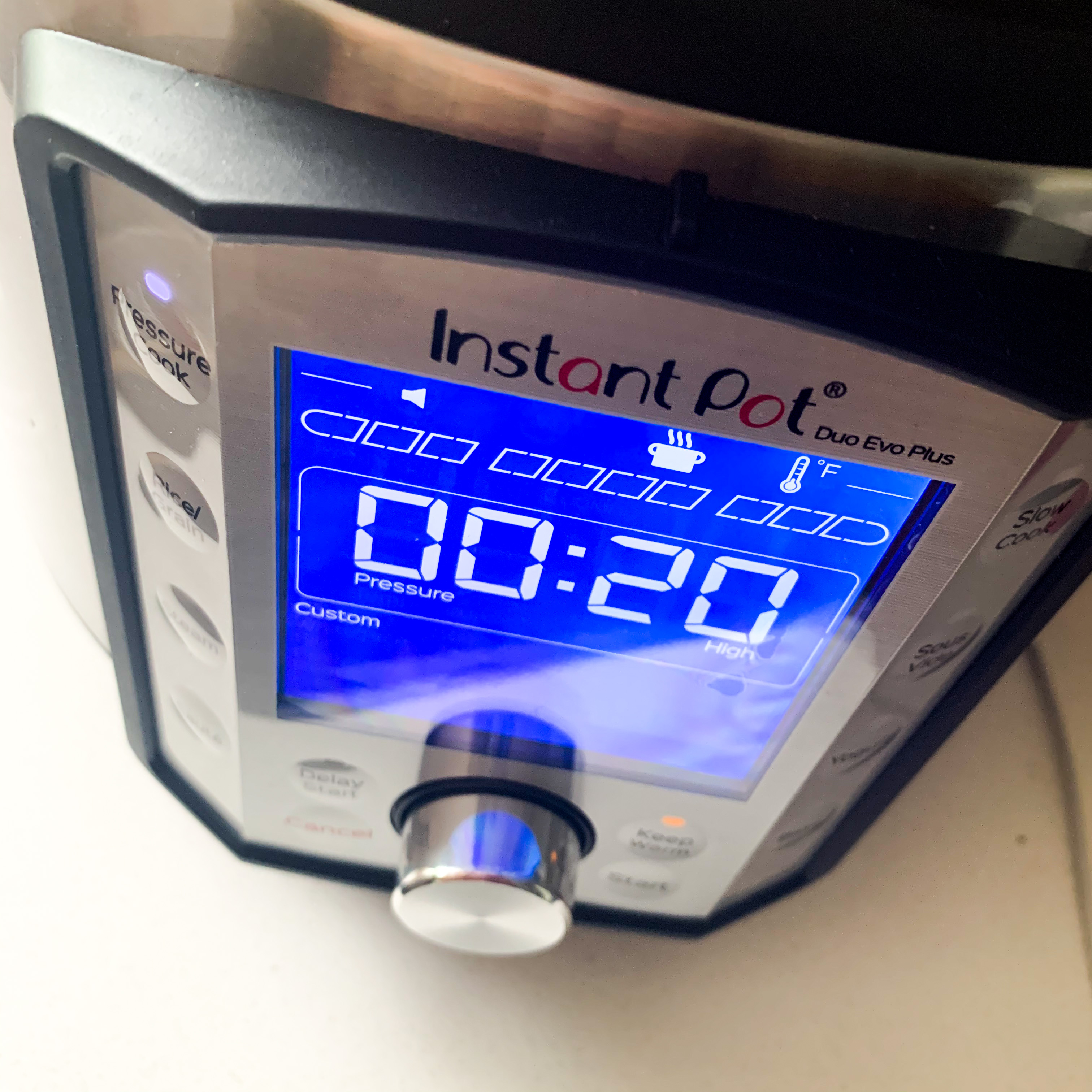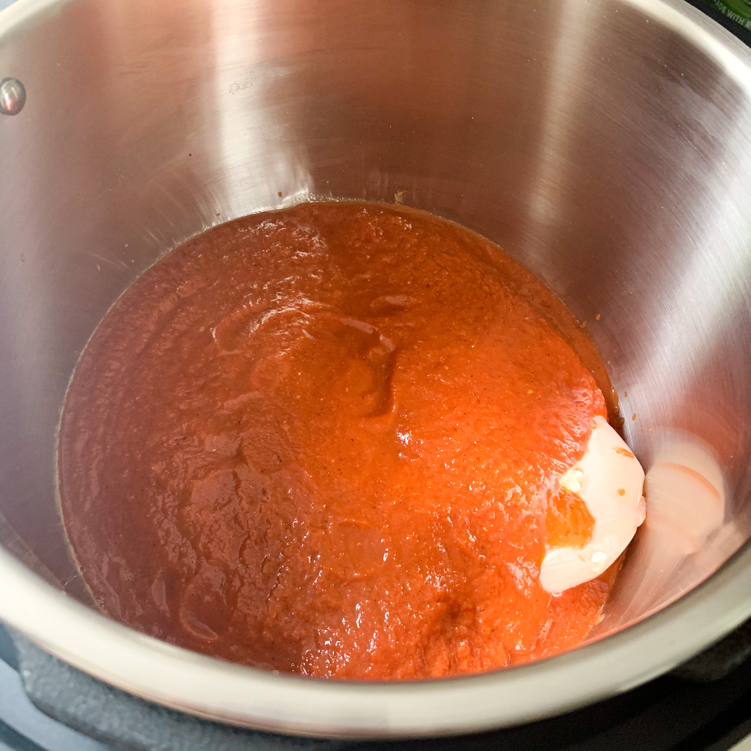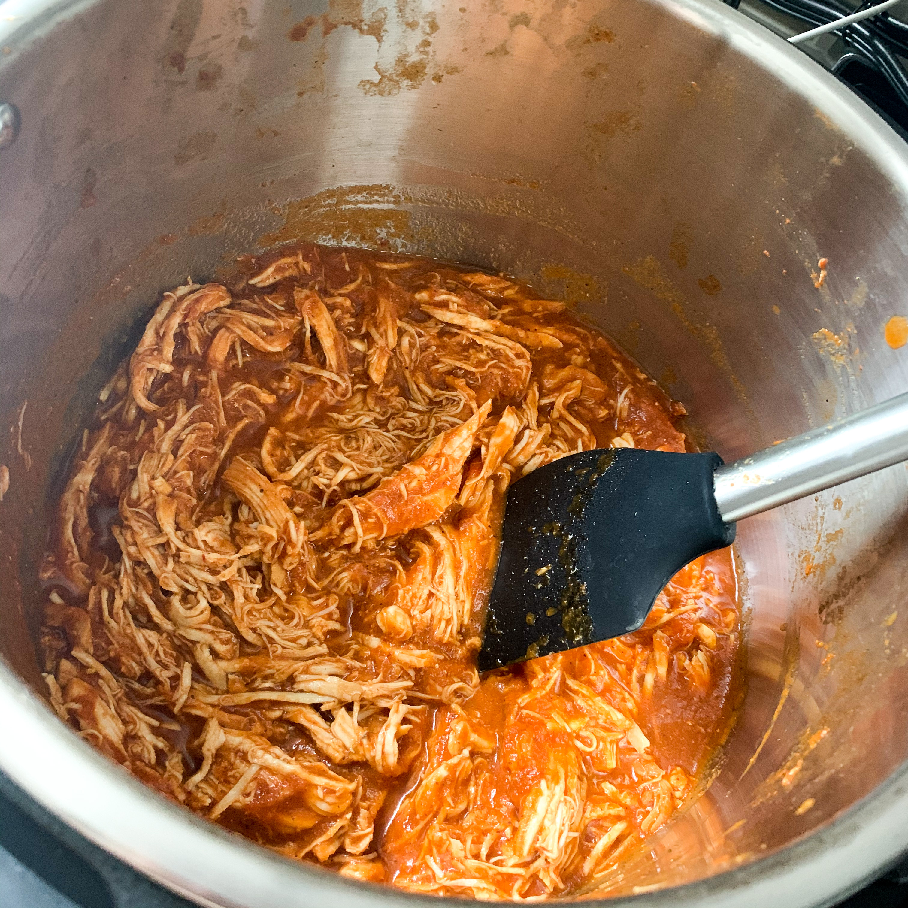 - Place chicken in Instant Pot, and pour sauce over top. Secure lid and close pressure valve. Set to 20 minutes at high pressure. Allow pressure to release naturally before opening. Remove chicken and shred, and then toss back in sauce.