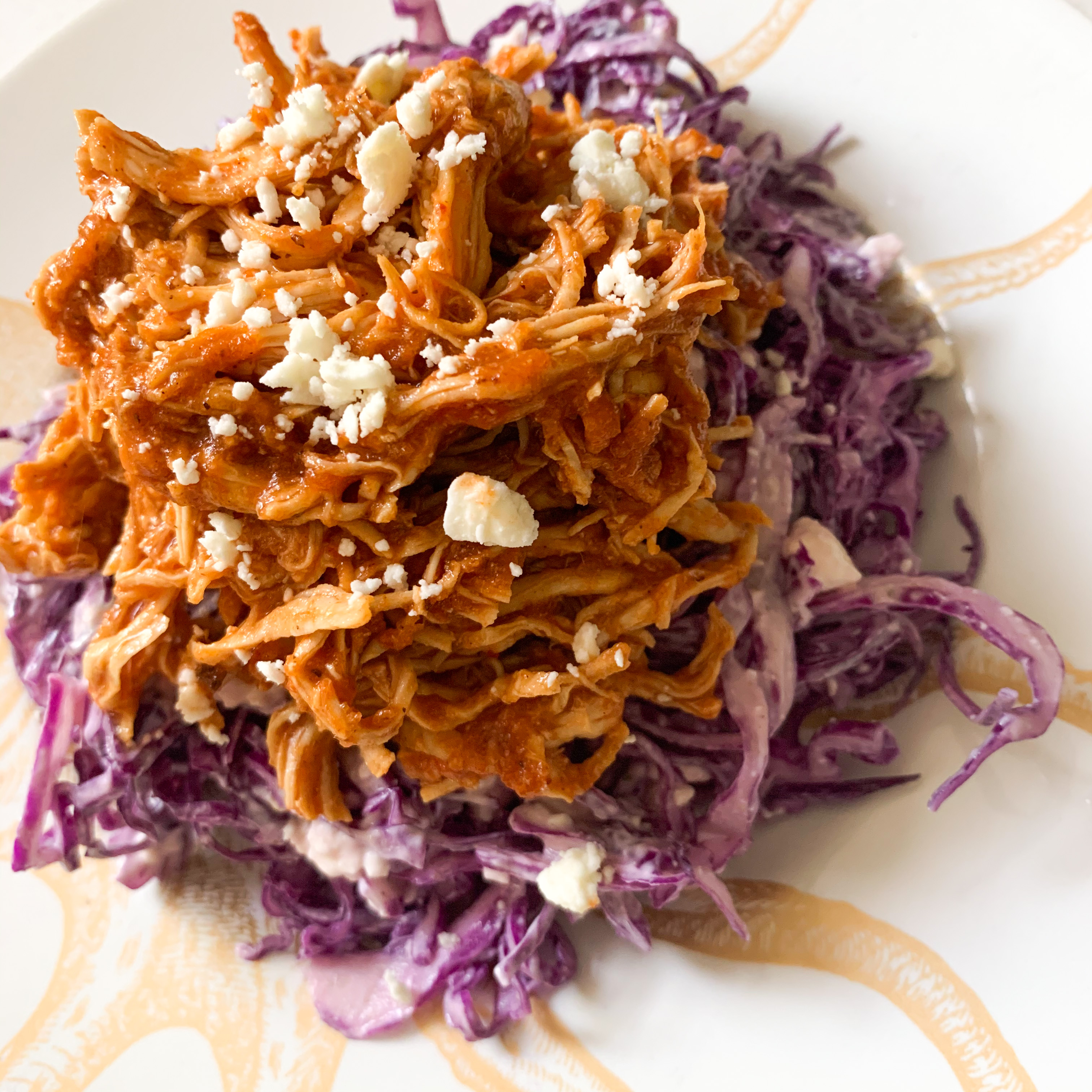 Feel free to double, triple or quadruple the slaw as needed. I make one serving at a time and freeze the remaining chicken for future meals. The meat freezes/defrosts beautifully!