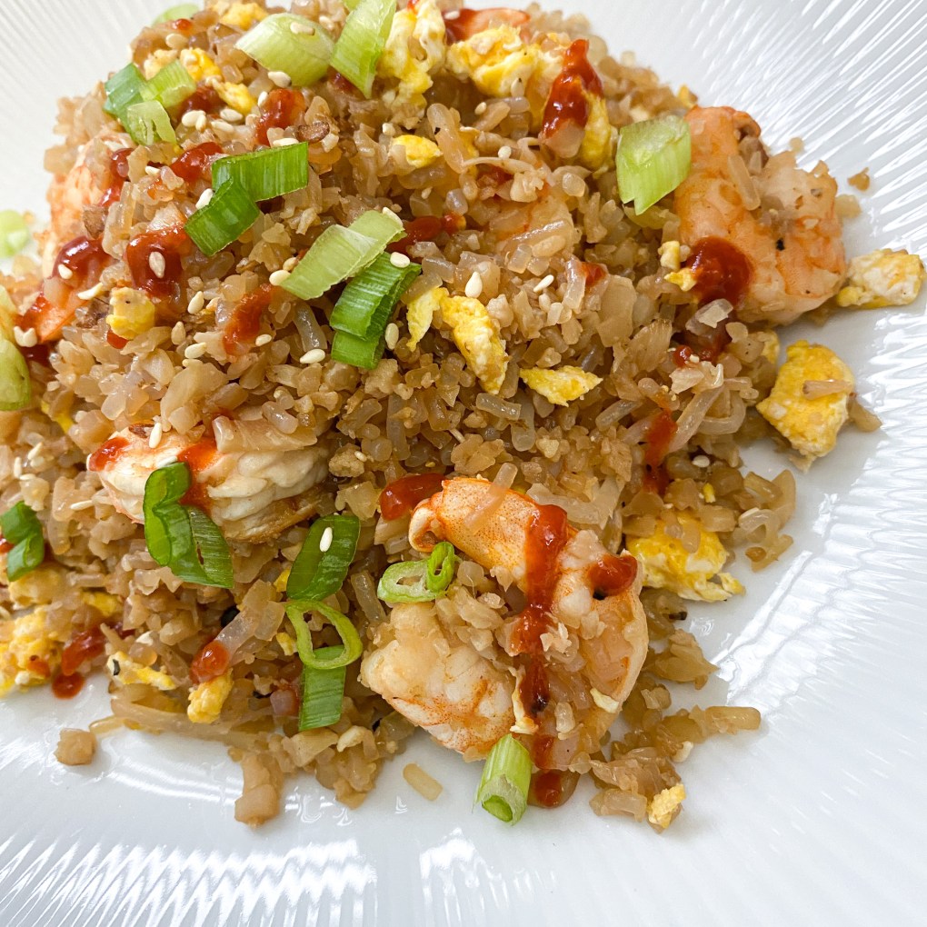 That said, this is my take on pajeon—a savory Korean pancake—one of my favorite lunchtime fuelings. Kimchi is considered a condiment; 1/4 cup equals one condiment, but I use 1/8 cup {or 1 oz}, which counts as only 1/2 a condiment and trust me, a little goes a long way. A big plus beyond the flavor it packs in there is that it has a ton of health benefits including it’s nutrient dense, contains probiotics, reduces inflammation, is purported to aid in weight loss, and supports heart health. I also add one ounce of shrimp from my daily Lean & Green. And 99% of the time, I’ll cook up the full seven ounces for the day, use the one ounce chopped up in this fueling, and then just reheat the other six ounces for dinner.